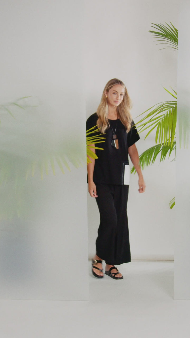 A stylish black top designed with a relaxed fit and modern contrast pocket detail. The crisp white panel adds a bold, contemporary edge while maintaining an effortlessly wearable feel.